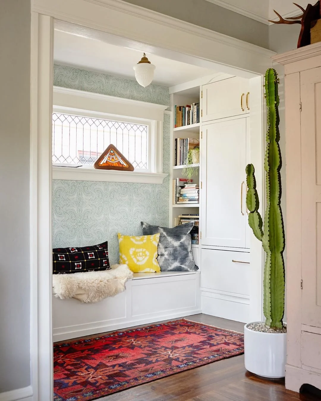 The wallpaper in this niche helps elevate this area and makes it feel like its own room. By adding the wallpaper, the built-in bench becomes a destination rather than an afterthought.